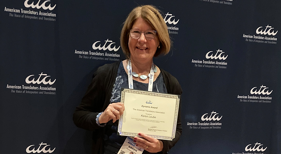 Ich wurde im Oktober 2023 auf der ATA Jahreskonferenz in Miami mit dem ATA „Dynamo Award“ ausgezeichnet. ATA vergibt den Preis an ein ATA-Mitglied, das sich besonders für den Verband bzw. den Übersetzerberuf einsetzt.