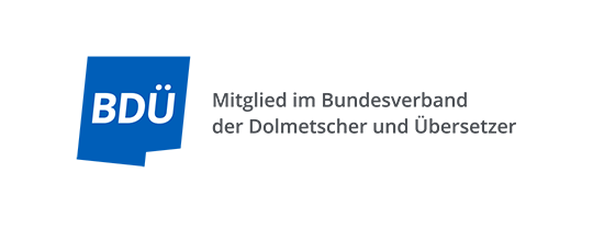 Ich bin auch Mitglied im Bundesverband der Dolmetscher und Übersetzer e. V. (BDÜ), dem größten deutschen und europäischen Sprachmittlerverband. Da als Vollmitglied in beiden Verbänden nur zugelassen wird, wer eine qualifizierte translatorische Ausbildung nachweisen kann, haben auch Sie als Kunde zusätzliche Gewissheit beim Einkauf meiner Sprachdienstleistungen.