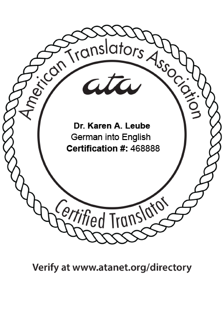 Karen Leube, CT, ist ATA-zertifizierte Übersetzerin für Deutsch ins Englische.